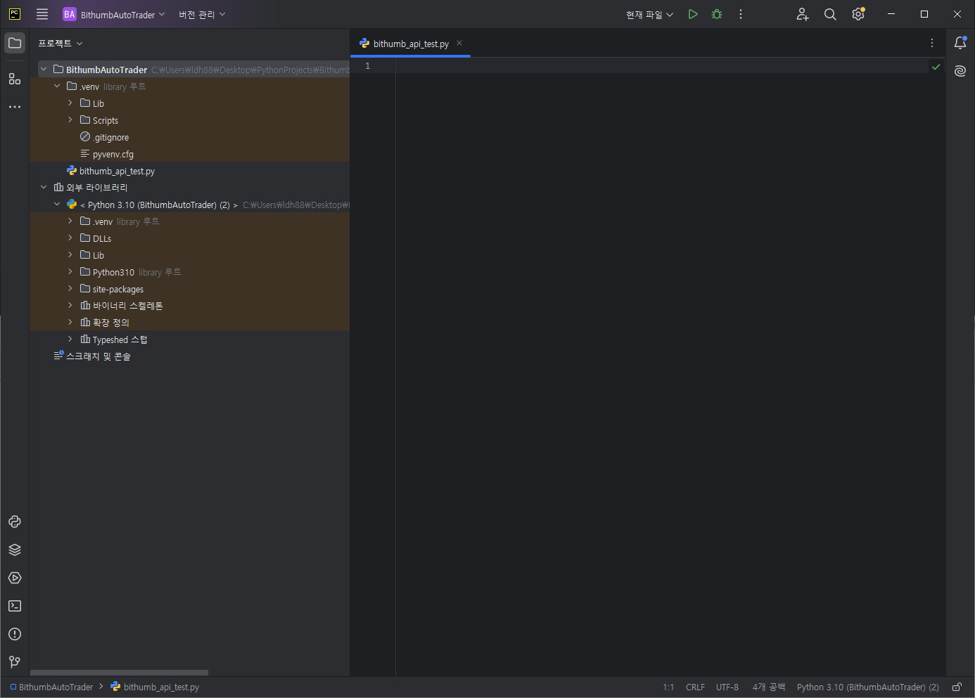 - 프롬프트 시작이 (venv) 또는 (.venv)로 시작하는지 확인한다. (아닐 경우 프로젝트를 위 절차대로 재생성 필요)